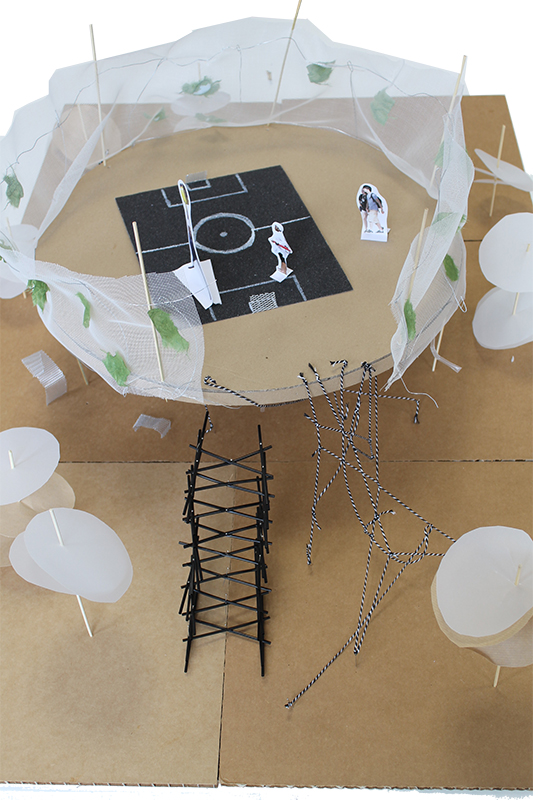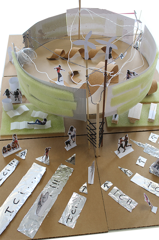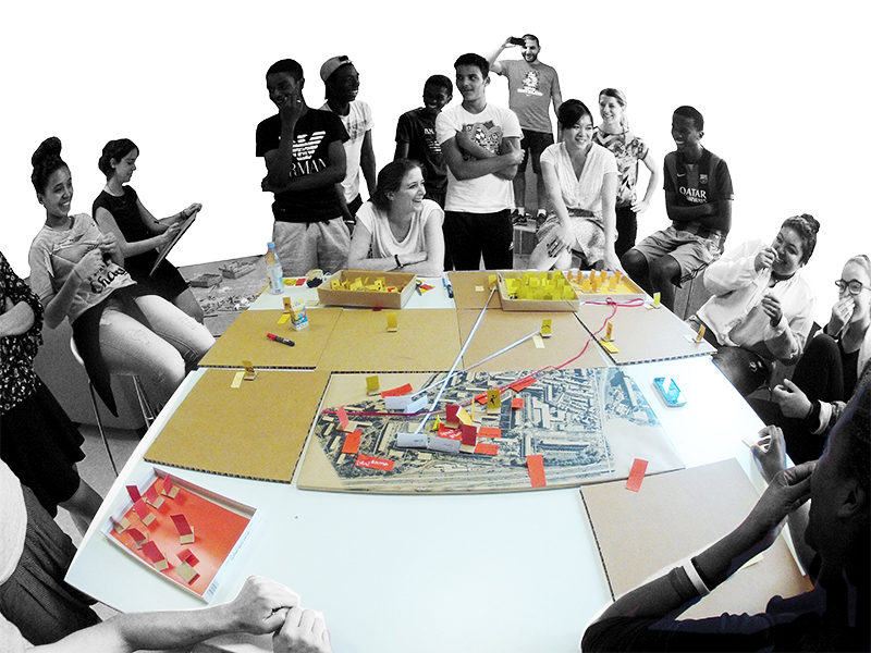 A la Courneuve, lors du premier contact avec les jeunes, on a pu observer qu’ils voulaient travailler essentiellement sur l’espace public. Nous avions apporté une maquette de leur quartier, sur laquelle ils ont placé les endroits les plus importants pour eux. A partie de ce premier échange, nous avons pu remarquer qu’il y avait un manque de loisir et d’activité pour les jeunes que nous avons rencontré.